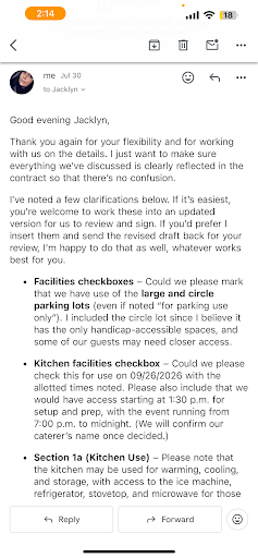 We asked for a few reasonable clarifications to be added in writing things that had been verbally agreed upon, such as confirmed parking arrangements, specific furniture counts, and use of certain kitchen equipment. As someone who works in the legal field, I know the importance of having details in writing to protect both parties. Unfortunately, our requests were met with resistance, and the coordinator refused to incorporate these clarifications into the final contract.