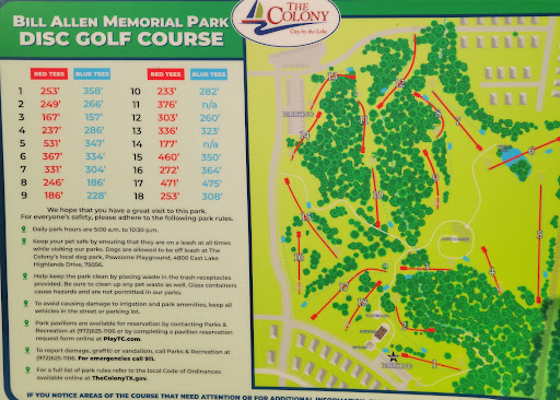 Read moreSweet little park smack dab on the edge of the colony, Frisco, and Plano! Great playground for the young kids, or a really well designed disc golf course for the big kids. Friendly and respectful crowds can usually be expected here, just make sure you yell four if your disc goes wide with other people around! Also a great spot for dogs, family outings, or just a chance to catch up with nature. I even got to pet a young wild squirrel once out here! Give it a shot and...