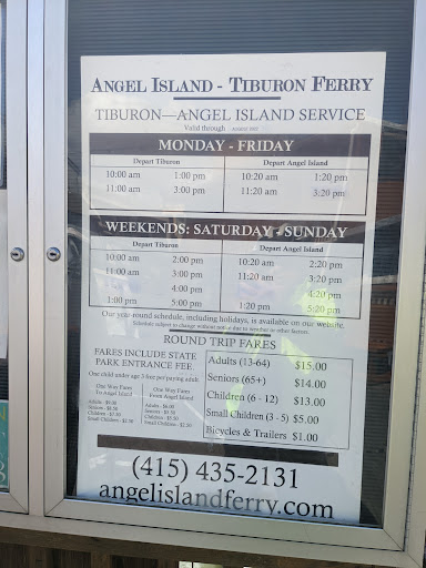 Overall, the ferry ride from Tiburon to Angel Island was great. The crew was friendly and fantastic - I'd give them all a 5. The ride was smooth, and docking was gentle. On the downside, I missed the first ferry ride at 10am because I could not find the entrance! It isn't marked at all. I had never been to Tiburon before. There is no sign I could find that says "21 Main Street" at the entrance. There is construction going on there, so maybe that is why. The "locals" were no help. I finally just started riding down the alleyways until I found the dock myself. There is a huge sign at the dock that says "Angel Island / Golden Gate Ferry". But you can't see it from Main street. Also, plan on getting there at least 30 minutes early to find parking. There are several lots that vary widely in price, depending how close you park to the dock. I found a lot next to CVS pharmacy a few blocks away where you can park your car the whole day for $5. Had to buy my pass (which covers the round-trip ferry ride, and includes the State Park access fee) for $17. Included in that $17 is an additional $1 fee for something (taxes?) and another $1 if you have a bike. The good thing about the bike, is they let you board first (before all the other passengers) to park your bike. Takeaways: 1) get there early 2) They need better markings on Main street on how to get to the dock and 3) I would suggest NOT taking the last ferry (3:20pm), as that is when EVERYONE has to get off the island, or spend the night there. I wish they had a 2:20pm ferry, but they only have a...
