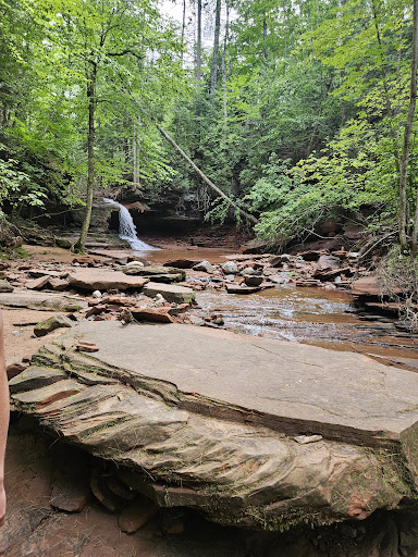 This out-and-back 1.5 mile (each way) hike is well worth the effort to see the beautiful waterfall at the end of the trail. The trail is at times full of rocks and roots, so be aware of your footing. There are a couple of picnic tables at the end of the trail, too, a little farther on (but no trash cans, so bring a trash bag to pack your stuff back out). This falls is approachable, and although it was cold today, I could totally see sitting in the pool of water in the red sand near the bottom of the falls or on a rock nearby. It was so different than other area falls because it's a narrow waterfall that shoots off to the side and lands in sand. The red rocks, sand and trees made for a beautiful and picturesque setting. Getting there is a bit confusing for a very short time just past the 1/2 mile point -- there's a bit of a jog just past a bench. But look at the sign just past the bench and you'll see which way it's facing, and that gives you a clue where a person would be coming from if they were reading it. Also, there are trees with 2 blue dots on them -- that'll keep you on the path at points where the leaves obscure it. Well...