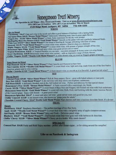 Read moreIf you are looking for sweet wine options, you must visit Honeymoon Trail Winery! They offer a multitude of options, many of which are award winning. This Niagara Wine Trail stop is quaint and cozy. It could benefit from a little refreshing and updating. They have a cute retail store with gift options located upfront along with a tasting room in the back. They offer a pretzel and cheese spread tasting. This was a bit disappointing. The cheese spreads are really tasty, but the delivery is very awkward. Someone comes by and brings you individual tiny stale pretzel sticks dipped in a little cheese spread. They are brought out one by one, wearing big rubber gloves. The gloves are appreciated for sanitation, but their presentation in this way really cheapened the experience. It would be much nicer to have a tiny bowl of pretzels along with the spread at the table, allowing us to handle them ourselves. It would no doubt increase their cheese spread sales! They also offer wine slushies, which were very enjoyable. A few improvements could really transform...