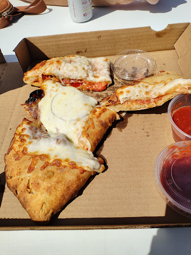 The pizza is delicious! I had a calzone and garlic cheese bread and my friend and her daughter split a pizza and garlic cheese bread. The bread comes as cubes with marinara for dipping and they slice the calzone for easier consumption. everything is made fresh. I went through the Blue Barn to use the restroom and the kitchen door happened to be open for a moment. Saw someone working the dough. Yum. I bought a huge rice crispy treat to take home, and my friends split a piece of rhubarb cobbler(?). Both were scrumptious - and yes, they make them both. They have a selection of NA beverages and a separate bar. They sell Wisco Pop! Sparkle which are sodas made in Madison, WI. Never had that before so I tried the strawberry and then the cherry. Just delightful! Very refreshing on a hot day.