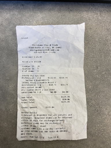 Read moreI made a purchase in April 2022 a used PlayStation 2 slim, brand new controller and a is used ready 2 rumble game. I was excited to finally find a place that have it. I even let the salesman open it in front of me in the store to make shore it work. When I got home that day it was not working. The boxer character I had would freeze up. I returned the next day a spoke to the same sales person for a refund. He said to me I don’t take back used games for refund. I was within the 14 days for a refund. I will prove this is my receipt in the photo. I left the store with disbelief that he would tell a grown that. So customers please be aware of issues like this when you purchase at this location. They don’t care what the receipt says. I left the store quietly with disbelief. I will never buy...