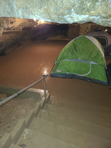 Cave camping! Not an experience to pass up! I give it 4 stars because of this, but the operators could definitely make it better. The Bathrooms/changing area were up the mountain and across the parking lot, and were not heated. The "community" fire was tiny, only 6 out of 300 people could actually enjoy it. The arcade/ gift shop was very small and was always too full for anyone else to enjoy. There was really no place to just sit down and enjoy a card game or anything. But.. The cave itself was awesome. Lots of places to explore! I really liked the fact that there was tons of people everywhere, but it was hard to find a spot big enough for our group of people, we were brought to one area to set up that wasn't big enough and ended up packing everything back up and moving further down. We weren't aware we could bring tents, but lots of other people did and I would recommend bringing a small one, the ceiling drips constantly and even in a drier area and a tarp over us, we woke up wet.