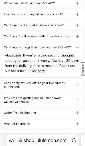 After speaking with the GEC, this store manager is incorrect and I was in fact entitled to a full refund. You can even see from Lululemon’s own FAQ on sweat collective returns, I was well within my rights to a refund. The GEC rep on the phone processed my refund and said she had idea what the store was talking about and apologized for the confusion.