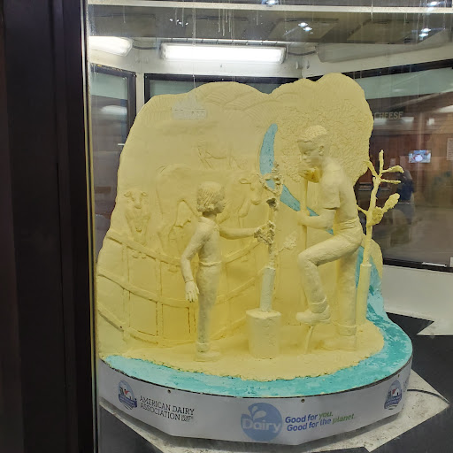 Read moreWhile Saturday was rainy, the fair exhibits were interesting. The several piglets, some just recently born, were intetesting but we were disappointed that there were no llamas in the "goat, llama, and swine" barn. The horse carriage driving competition turned out to be quite interesting although i still have little idea about what was being judged. The dinosaur exhibit was surprisingly good, and interesting that a lot of less commonly known dinosaurs were included. The butter sculpture was bizarre. The idea that one would sculpt someting out of butter is strange to begin with but this one was curious, depicting a White family at the beach and a Black farmer. I realize that butter sculpture has become de rigeur at state fairs since i first heard about it decades ago. My partner said that instead of making a butter sculpture they should donate the butter to people who...