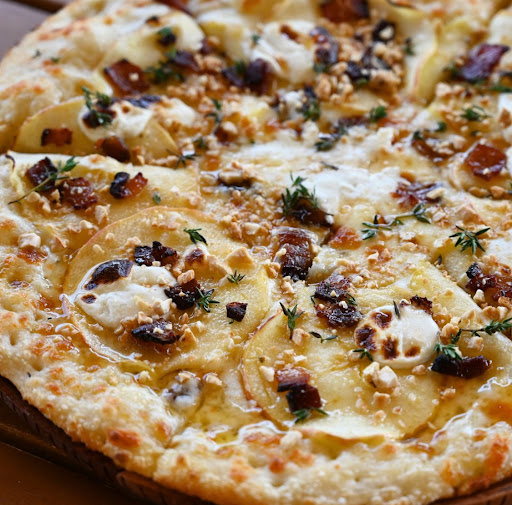 The pork products from Grazin! Acres are simply stellar. The care and dedication that go into raising their animals translate directly into the superior taste and quality of the meat we serve. Our customers consistently rave about the rich, succulent flavors, making these dishes some of the most popular on our menu, like this apple bacon pizza!