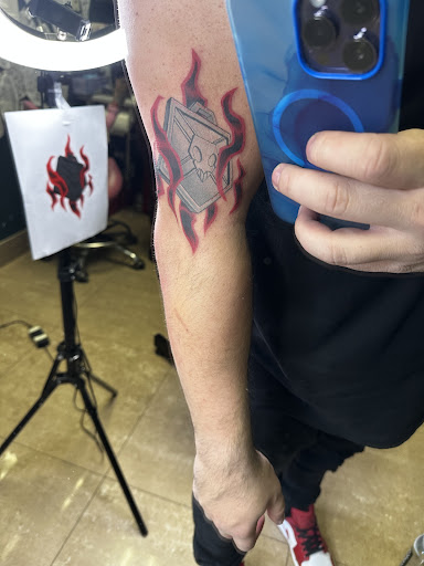 Read moreThis shop is clean, professional and funky, and on my various visits there to explore flash art for a tattoo I'm considering I've seen all kinds of clients getting inked. My boyfriend and I brought his niece in to get a piece done. She had an idea of what she wanted and Chris Koutsis worked something up for her on the spot and she loved it. As we waited for her and flipped through pages of flash we enjoyed some cool music and were digging the people-watching opps as customers came in and inquired about tatts or went to their appointments. Comfy couches, magazines and a public restroom all lend a customer-oriented and pleasant vibe to the place. Our girl walked out of there with a big smile on her face! She was given precise directions on how to care for the tatt as it healed and how to maintain its beauty over time. It is a well-run place and most of the staff is heavily tattooed which definitely made us feel like they knew their stuff and they shared it with everyone who came through. BADASS shop - I'll be pulling the trigger on my next one there...