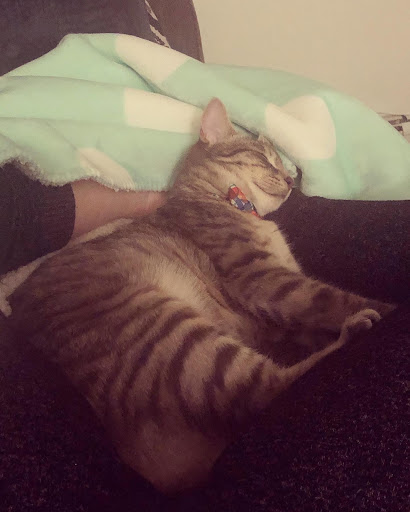 My cat's name is now Mochi and he has been with me for a couple weeks now. He stopped hiding under my bed two days after coming home and now follows me around everywhere I go in my apartment. He recently has discovered he can sit on the window sill and watch what's going on outside.