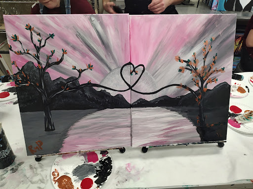 The positives: The studio was nice with lots of lovely paintings on the wall. Ample design choices (3). Scheduling easy. Price reasonable to create a memory together. Class started on time as it was already later 7pm and I know my husband wouldn't go beyond 9 pm. I loved the design we chose. The materials were ample.