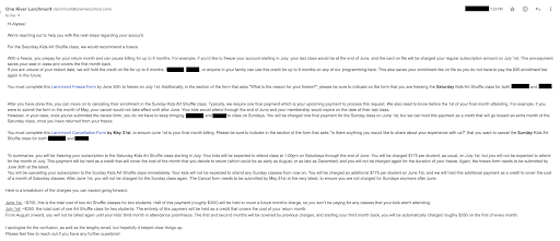 After talking with someone at pickup about getting clear on our account, and how it was pretty hard to cancel (RED FLAG), I got this insane email explanation (screenshot attached) that made my head spin. So I called and asked to speak with the director to clear things up — I remember needing a simple yes/no for a refund for an extra charge that was a mistake (RED FLAG). What I thought should be a 5-minute conversation turned into 30 minutes of him essentially refusing my refund. My head was spinning once more. Did the staff here all get trained in the same techniques of using word salad?