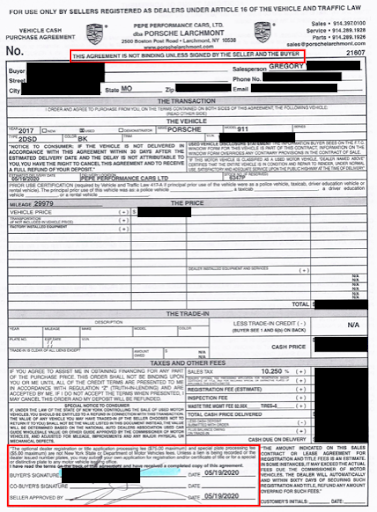 Or so I thought. At this point, the dealer began behaving weirdly⌠they didnât take the car down from their website, all the paperwork had wrong values, there were extraordinary delays in sending material to sign (weeks), and then they ultimately suggested that Porsche Finance wouldnât approve the deal unless I signed in person. Normally this would be no problem and I would fly there, however with COVID, flights were limited and I was risk adverse to traveling to the New York COVID hotspot.