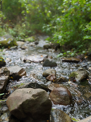 After crossing the creek you'll continue down a path for a ways, where you will once again be faced with an even bigger decision do I head down the creek or turn back. Fortune favors the bold and in this case I'd encourage you to just keep pressing forward. Now if you have little ones with you this may complicate things. If they are older they should have no problems; as was the case for our 7 and 8 year old, but at this point my wife continued to carry our 10 month old and I picked up our 2 year old to carry the rest of the way. If you're not carrying a tiny human odds are more favorable that you might be able to avoid getting your shoes wet, but since you likely value that tiny person's safety your shoes will definitely get wet - so just accept that. Regardless our journey of stepping across stones through the creek and climbing up small boulders (which it definitely helps if you and your spouse (or whomever you're with) work together on) was well worth it. The ravine around the creek was breathtaking and ultimately lead us to a small fall at the end that was equally beautiful. All and all I'd estimate that the trip to the falls and back was a little under 2 miles. While the creek walking is a bit technical it's by no means a barrier for most. Our older kids definitely had a lot of fun and despite carrying our little ones my wife and I enjoyed it immensely.