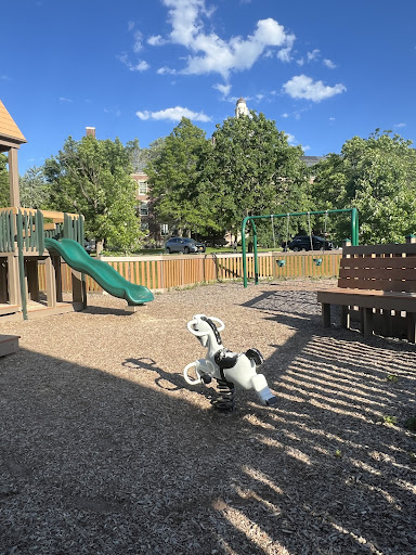 A small area for toddlers And larger area for older children my two year olds love to play in the sandbox and in the smaller children's area but now goes into the larger part I love that there are separate areas and different options such as slides swings climbing Bridges sandbox different wooden obstacles my child loves to interact with other kids there which also is a plus because every family that comes there is a very open and nice and accepting with communicating it's also in a gray area where there's a church and church bells go off wish my...