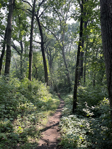 Good: you do get into the woods and it's a good workout. There are LOTS of incredibly beautiful butterflies, large and small (end of July). The trail is very well defined and has yellow blazes. Bad: I did not enjoy how narrow the trail was in most places, with vegetation flicking at me all the time. All I could think of was TICKS. Also, anytime the trail went up or down a hill, it was "paved" with round rocks of various sizes, the kind that love to just roll out from under you and try to break your ankle. Everywhere else was very smooth and flat surface.