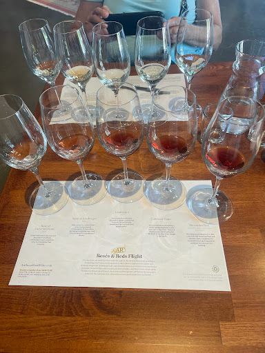 We headed over to Anthony Road Winery on 7/30 and were greeted and seated quickly for a tasting. There are a number of tasting flights to choose from, depending on your palate. I did two of the flights and my husband did one and then ordered a full glass. The space itself is lovely and very modern. The back of the winery looks out over the vineyard and beyond that, the lake, which makes for a beautiful view. The tasting is well done and reminded us of some of the tastings we did in Italy, where a mat is placed in front of you and the glasses placed on the mat above a description of each of the wines you are trying. The flights are delivered with some crackers for clearing the palate in between and our server was attentive and informative, describing each wine carefully and with detail. We enjoyed chatting with her about her passion for wine and the region. The wines were quite good and we enjoyed many of them - particularly the dry riesling, the vignoles, and the pinot gris, as well as the unoaked chardonnay and the rose. After your tasting flight, you can take a seat outside with a glass and order some charcuterie. On the day we were there, a food truck was on the premises (My Eva) serving Mexican food. We had a DELICIOUS chicken quesadilla that we took to go for the road. A little greasy, but so well seasoned, cheesy and delicious. Yum! Overall, a great experience at Anthony Road - would definitely recommend if you're...