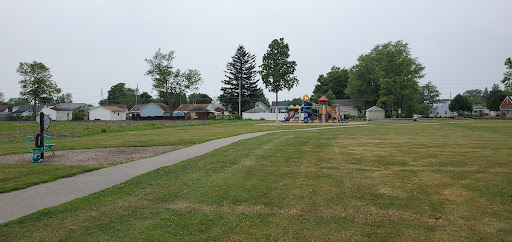 There's a playground, a walking path with some exercise elements, 2 baseball fields, a small picnic shelter, and a basketball court. You can park in the parking lot. There's a lot of grass for activities. The playground looks nice. The basketball court looks ancient; it has a rough asphalt surface...