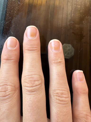 This is a really lovely place to get a mani and pedi. The staff are nice, knowledgeable, and well trained. The services were just as described. There are two issues: (1) The Polish: You have to use their nail polish brand which is limited in colors and I found the formulas to be lacking in terms of staying power. My toes NEVER chip after a pedicure (which I have gotten monthly for over a decade) within the two weeks. This started chipping off within four days. (2) Nail Staining From Products: After taking off the nail polish on my hands (after two days), I noticed that there was major staining on my nails. They put something that stained my nails rust orange (see picture). I can not get it out and it was not there before my service (my nails were clean and had no polish for several months previous to let them breathe and grow). It is directly where they put one of the products on each nail. Given the staining, I can not suggest this place which is a bummer because the mani and pedi services were otherwise very good.