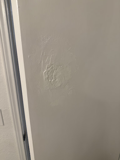 The front door is out of code, with a gap so large I had to stuff foam in it for safety until someone comes to fix it. The closet mirrors won’t close due to protruding nails, and the warped door is bowing dangerously close to shattering. The carpet is super thin, the vents are filthy, and the ceiling fans are yellow with grime and have mismatched light bulbs — including one from a Christmas light strand.