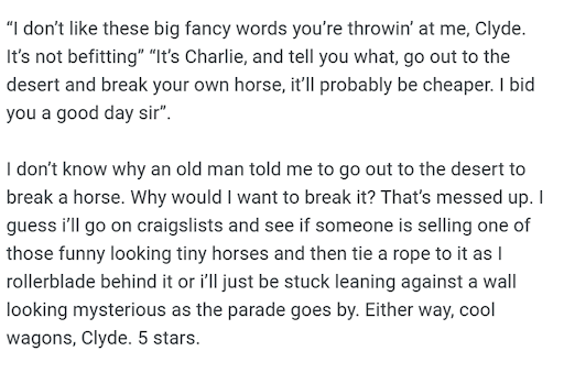 I was about to take 1 star away because there wasn't an old man with playing a harmonica in a rocking chair outside but then I walked past the gates into a big ol honkin warehouse with a gentleman's plethora of chuck wagons, carriages and frontier artifacts galore. It just about yee'd the last of my haws. Then an older cowboy gentleman with a white handlebar mustache approached me and said “howdy cowboy, lookin for a tour today”. I tipped my hat and said “howdy, Clyde”. “My name’s Charlie, partner”. I didn’t care. I said “Listen Clyde, i’m actually here to procure myself a horse and a buggy for this here parade coming up in a fortnight.” “Sorry, young man, we sold out of rentable wagons about a week ago.” I immediately broke my cowboy cool and cried like a teenage girl “Aww, cmon! Are you serious!? NUH UH!” Clyde looked a little shocked but maintained his cowboy cool: “well, you can ask around and obtain one from private sellers, i’m sure. Just make sure it falls in line with the TRP regulations and—-” “what about horses, ya’ll got some wild broncos hangin around?” “Well not exactly, you would have to contact those who specialize in the equine lifestyle” “Equine?” “EeeeQUINE!”...