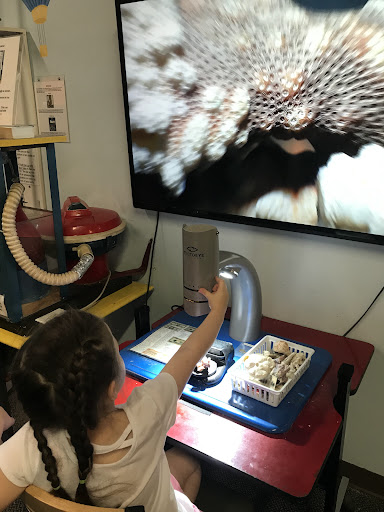 There were a few building stations, weights, a vacuum and bowling ball exhibit, an ultraviolet light room, a microscope, and a hallway of geodes and beetles and things. It led to another hallway with a variety of actual animals that had been stuffed, and a room off of that with snakes, lizards, turtles, butterflies, and cockroaches to see.