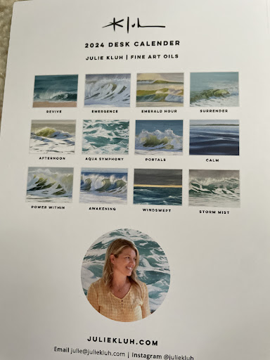 I recall my first time being aware of Julie’s art. I believe it was an Instagram post of this gal who sailed from island to island in the tropics, collecting shells, painting incredible small wave and ocean scenes, I never quit looking for her feed. I have watched her paint increasingly larger canvases and really finding her sweet spot in water. I had the great pleasure of traveling to see a friend in Olympia and went to a gallery where her work was being shown. I swear I could feel the salt spray on my face. So beautiful. Now she is in her own gallery, and she has inspired me to work on my painting every day. She is a true water baby, kind, talented, always takes a moment to respond to a compliment. As with the ocean, there is no end to her inspiration, talent....
