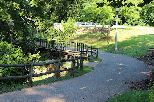 At the Northern end is Manderson Landing, a large multi-tiered boat landing and park that is owned by the university and the city jointly, I believe. The trail extends about .5 miles past this popular area where it abruptly ends - however, there is a user-created walking path which will take all the way to the northern bridge, underneath, and ends in a large conglomeration of student apartments.