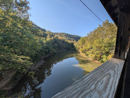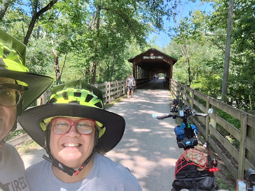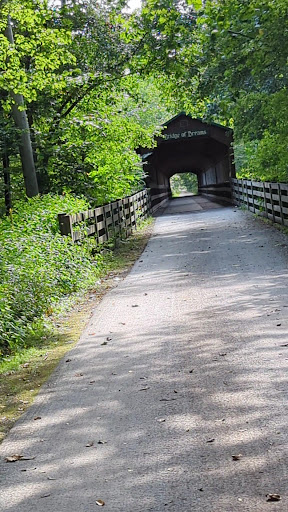 Read moreThis is a very long covered bridge on the Kokosing Gap rails to trails multi use trail. The trail bed itself is mixed crushed stone and dirt. This area is inhabited by many in the Amish Mennonite community, so, the trail is utilized regularly by horses, horse drawn carriages, buckboards, carts, bicycles, etc. The bridge has a padding in place to accommodate this traffic as well as a high side so the horses can't see that they are over water and freak out. There is a parking lot and a small picnic shelter near the bridge. The road up is a bit washed out, but, easily passable. The trail can be traversed for many miles of one so desires. We find the trail to be moderately wheelchair friendly. The river underneath is frequented by canoes, kayaks,...