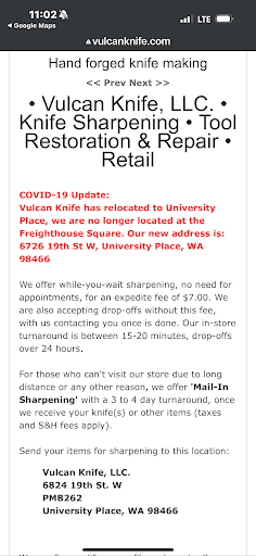 Read moreSo I’ve been using Vulcan Knife for years to sharpen my knives and have always been satisfied until today. I live in Kent so it’s a drive to make it all the way down to Tacoma to have my knives done so I’ve always utilize the drop off service with the expedited fee and I’ve always been able to come and get my knifves sharpened within 20 or 30 minutes, pick my knives back up so that I can head home. Unfortunately, today, the gentleman at the counter told me that they no longer do that only on Saturday, even though there is nowhere on their website that says that. It still says that it’s an expedited service for a fee and no restrictions are listed at all. That’s very disheartening for them to have that posted on their website and then after a customer drives that distance to be a loyal customer to be told no even though that misinformation was due to their own generated website. Very unfortunate because now I’m going to have to find a different shop to have my knives sharpened at and the six other people that I have gotten to come here from Kent to have their knife sharpen I’ll be sure to let know to no longer come because the service is not what it used to be or what is stated on their website and I don’t want my friends making a trip all the way down here to be turned away. Because of today’s experience, I have no other option but to leave a one star review so that other people will possibly be able to see this and know that they’re not able to actually have drop off service. I’m including a screen grab of their website showing what they profess to offer and then no longer...