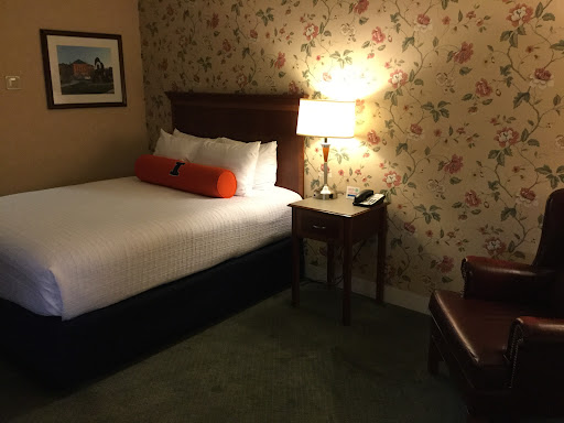 A buddy and I recently decided to pay a return visit to our alma mater, the University of Illinois in Champaign/Urbana and decided to stay at the Illini Union Hotel. You can’t beat the location - in the middle of the campus on the north end of the “Quad” and a block from campustown.||Our double room was booked directly through the hotel and our Saturday night stay set us back $145 77. We had no problem getting a weekend room since it was spring break. No problems with check-in and the front desk staff was very friendly.||Free parking is available next to the building. There is no pool or exercise room directly on the premises. The basement has a bowling alley though.||Our room was adequate in size and tastefully decorated. We were also able to score a room overlooking the Quad facing the Auditorium. It had a flat screen TV, small fridge, coffee maker, safe and iron and ironing board. There also was a desk/chair and a separate wing chair.||The bathroom was clean and contained the usual amenities, including a hairdryer and a selection of tetra green toiletries. (A nice touch - Braille on the toiletries’ caps.) Shower pressure was fine. ||We had no complaints about the beds and appreciated the four pillows on each bed.||The room rate included a $5 voucher for each of us toward breakfast at any of the food places in the Union. (There’s a Starbucks on the first floor and a food court in the basement, but only the Starbucks was open on Sunday due to spring break.)||All in all, a good choice. But if you can, ask for a room with a view...