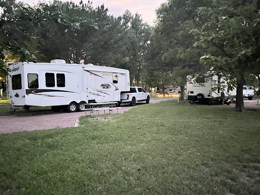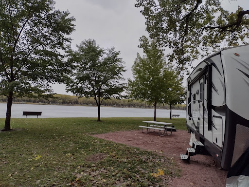 This is a great campground by the Corps of Engineers. It has around 50 sites that sit beside quiet Lake Yankton (No power boats, just electric or muscle power). It has easy access to boat ramps on both the river below the dam and the lake above. We had site 29, right inside of the entrance. Surprise to us it had FULL hook ups, including 50 amp power. There may be only 2 such sites on the grounds. Most have no water, but a number of hydrants are scattered around the area. Site is VERY well maintained with a crew that cleans restrooms and grounds multiple times per day. It is a flat. easy walk from the grounds to the dam down a paved road with quite light traffic and a wide shoulder. People seem to be fishing from the overlook nearly anytime of day. This location is well shaded with hundreds of huge cottonwood trees throughout the grounds. Each RV site is paved and has a large crushed rock sitting area right outside your door, with a nice aluminum picnic table and fire ring included. The space is quiet and not near any busy roads. If the spillways are open at the dam you can often hear the distant rush of the water. I highly recommend it, just be prepared to use your fresh water tank. Dump stations are easily reached about a mile...