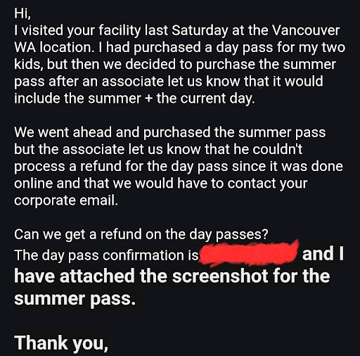 We purchased a day pass for both of our kids. When we arrived the gentleman at the counter convinced us to buy a summer pass, which included a day pass on the same day we were visiting. He specifically told us we would be refunded, but that we had to call/email the corporate contact that he provided us. We went ahead and purchased the summer pass based on the info he gave us.