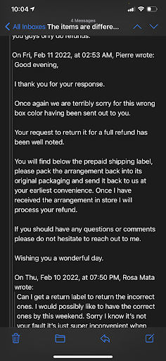 However, that was not the case. It is the 14th today, and the roses were not delivered. It has been a nightmare trying to contact customer service - the phones go straight to voicemail or ring until the answering machine begins, they have live chat available but do not respond, and they do not respond to emails.