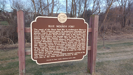 A historical marker set in a small area with a picnic table and nice flowers, right behind the "Welcome to Blue Mounds" sign, in between Cave of the Mounds and Blue Mounds State Park.