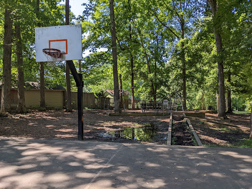 My three young kids and I visited to check out the bike pump track. There was a small parking lot with Porta potties nearby. To get to the playground and the track, we walked up a small hill following the trail past the large pavilion with picnic tables and charcoal grills. The playground was small, but shaded with a couple of benches around it. There was a lot of climbing equipment and a couple of things that spun. On the farther side of the playground was a basketball court, and just beyond that was the pump track. While the playground and basketball court were shaded around 11 to 12, the track was in full sun. Nonetheless my nine year old loved it! It was nice to have a playground area right nearby for the younger ones who weren't up to navigating the pump track. I was able to sit next to the basketball court and see both areas fairly well. We plan on going back to play and further check out the trail to the pond...
