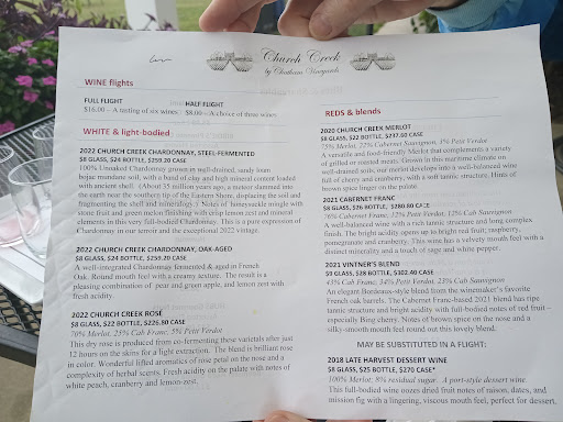 I purchased a bottle of “Church Creek Vintner’s Blend 2019,” although because I was driving and had a long way to go, I did not do any tasting. The tasting room is very pleasant, and there were many al fresco tables on the lawn, many of them occupied although it seemed a fairly hot day. The two attractive young sommeliers were very friendly, informative and welcoming, even giving me a very welcome bottle of cold water at my departure.