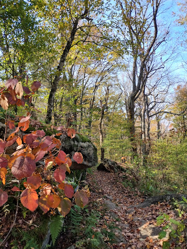 This trailhead on the Appalachian Trail provides great access to the summit of Mount Rogers, the highest point in Virginia. There is a moderate amount of parking, so it might be good to arrive early, but it wasn't crowded when I was there (October 13). There is a convenient vault toilet at the lot, along with two bear-proof trash receptacles. The trail to the summit starts right across the street from the parking lot. Head up the trail and follow the signs to the summit of Mount Rogers. Essentially, from the trailhead you will follow the Appalachian Trail until you reach the Mount Rogers Spur Trail. (There's good signage and a decent number of trail blazes.) The woods are lovely, and the fall colors in October were very nice. There were several places on the trail where downed trees from Hurricane Helene blocked the trail, but hopefully some chainsaw crews can get those cleared before long. I spent about four hours hiking to and from the peak (with some time spent at the top), and I would characterize the trail as just moderately difficult. I found two survey markers on the peak (check the large boulders 🙂). This was a lovely Sunday...