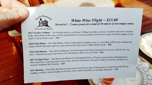Read moreMany quality wines with highly knowledgeable staff. The 2022 Chardonnay was our favorite, hands down. It didn't taste like a typical Chardonnay but then I'm not used to wines age in the "sur lie" style! I love that North Mountain's wines are all made wjth grapes that they grew themselves (estate wines), which is dadly something that so many Virginia wineries no longer do for all their wines. If you're looking for a huge, modern winery, then this is not that. This is a winery that was founded in 1982 and spends far more time focused on the wines themselves than the furnishings or architecture of the tasting room. If you want a someone with an encyclopedic knowledge of the science of wine (!), then Andrew, the assistant winemaker, is absolutely your person. If you're lucky, you might meet the "owner" of the winery, a dog...
