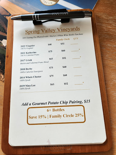 My neighbors brought me home two bottles of Frederick wine from Spring Valley. It is awesome. We went to the tasting room in Walla Walla WA. There was a young woman that spoke fast and poured tiny pours into our glasses. We sat back and began talking to each other as you do with friends on vacation. There was a young man behind the counter that came up to us at our fourth pour and poured us our 4th. Whilst pouring he stated that he was sorry but this was our last pour and we needed to leave, he stated our fee was waved. He felt we were slurring our words. As he is pouring another drink in our glasses he says he cannot serve us. We had just come from lunch and were not intoxicated at all. We took our fourth pours and set them on the counter and left. We walked away in total astonishment. We are 3- 54 year old women that were quite beside ourselves on such rude behavior. Wine is great...
