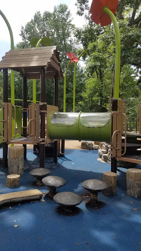 This playground was redone in about Spring 2014. The playground has a lovely rubber service (old photos have the wood chips). One thing I had not seen elsewhere was something for the under 2 crowd. There is a little mount with 2 small slides for the 6 to 23 month crowd. The various playground structures are fun and incorporate wood stumps. They look beautiful. The area is shaded by several tall trees. This playground has no water features (other than 2 sets of drinking fountains). Overall, great for the...