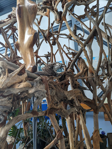 When you enter, you're greeted by a "sculpture" made of driftwood that supposedly represents the state. The top is pinecones, to represent the mountains, the middle is washed up bottles to represent the Raleigh/Durham area, and the coast is represented by parallel sticks. The pinecones are pretty clearly from long leaf pines, which don't grow in the mountains, the bottles look trashy (are they saying RDU is garbage??), and if you were not told that the parallel sticks were supposed to be plowed fields, you'd have no idea. Dumb.