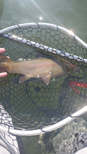 Lake is fly fishing only and catch and release only and has some big trout. Spin/bait fishing here will get you yelled at by the fly anglers at best and a pricey ticket from the game warden (who lives on the hill above the lake) at worst. Wouldn't recommend it for a swimming spot, gets toxic algae blooms in the summer/early fall. Lots of people tend to stop by and take a look around from their car due to it being right off hwy 20. Definitely not a quiet spot either with the jets going over and hwy running by it. If you can tolerate all that it's great for fly fishing or a walk around the trail. Want to be really un popular with the local anglers? Clog up the boat ramp with children wading in the water. There are lots of great swim spots on other nearby lakes (without algae blooms!). Spend the extra 5 min googling and take the family to one of those and leave this for the kayakers...