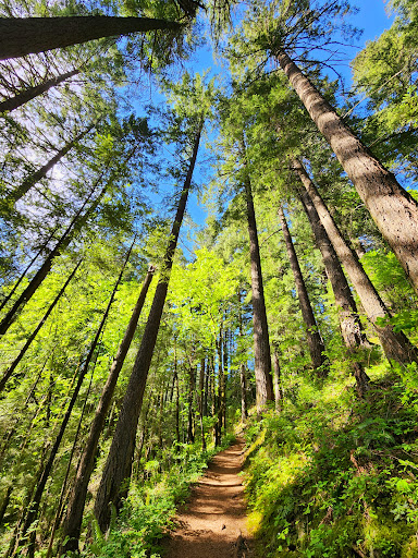 This is a beautiful, lushous green, wild flower filled multi-use trail (pedestrians, cyclists, and esquestrians) on Hamilton Mountain, which is located within Beacon Rock State Park. It leads to the Hardy Ridge Trailhead, the Saddle Viewpoint, and the Hamilton Mountain Summit.