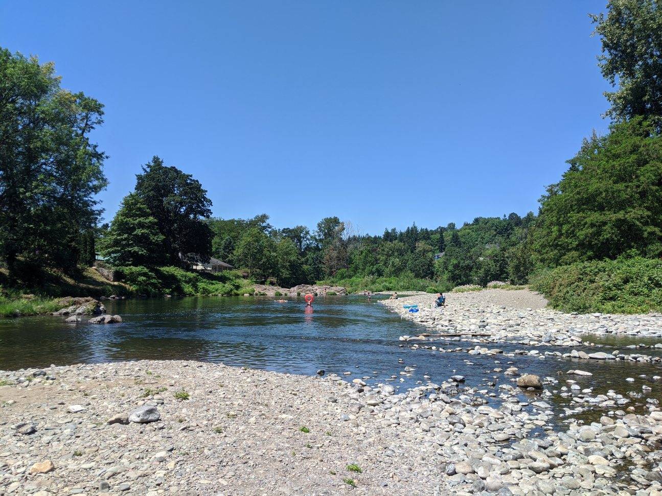 Great local swimming hole right over the state line into Washington. It's easy to find unlike a lot of other swimming holes we've visited, has a parking lot, bathrooms, bike rack, ramp, and beautiful clear water. On the to be prepared for side, the ground is really rocky and there's no shade. Next time I would definitely bring a zero gravity chair and an umbrella to be super comfy! There were kids of all ages and adults and everyone was having a good time while staying distanced. A group of teenagers was jumping from a platform into a deep spot. My girls were screaming and trying to skip rocks. Some tubers floated past us. And a family down the beach was playing music to give us some background music. The viewing platform right off the parking lot has picnic benches and a great view of the river. I don't know if this is a regular thing, but when we got there at around 5:30, the ice cream truck was just pulling through! I'm not sure when we'll be back since it was quite a haul, but I would definitely return and highly recommend for anyone nearby. It seemed about 5 to 10 degrees warmer than where we are in Portland, and a lot of folks were just showing up as we were leaving around 7: 00pm. It looked like evening might be...