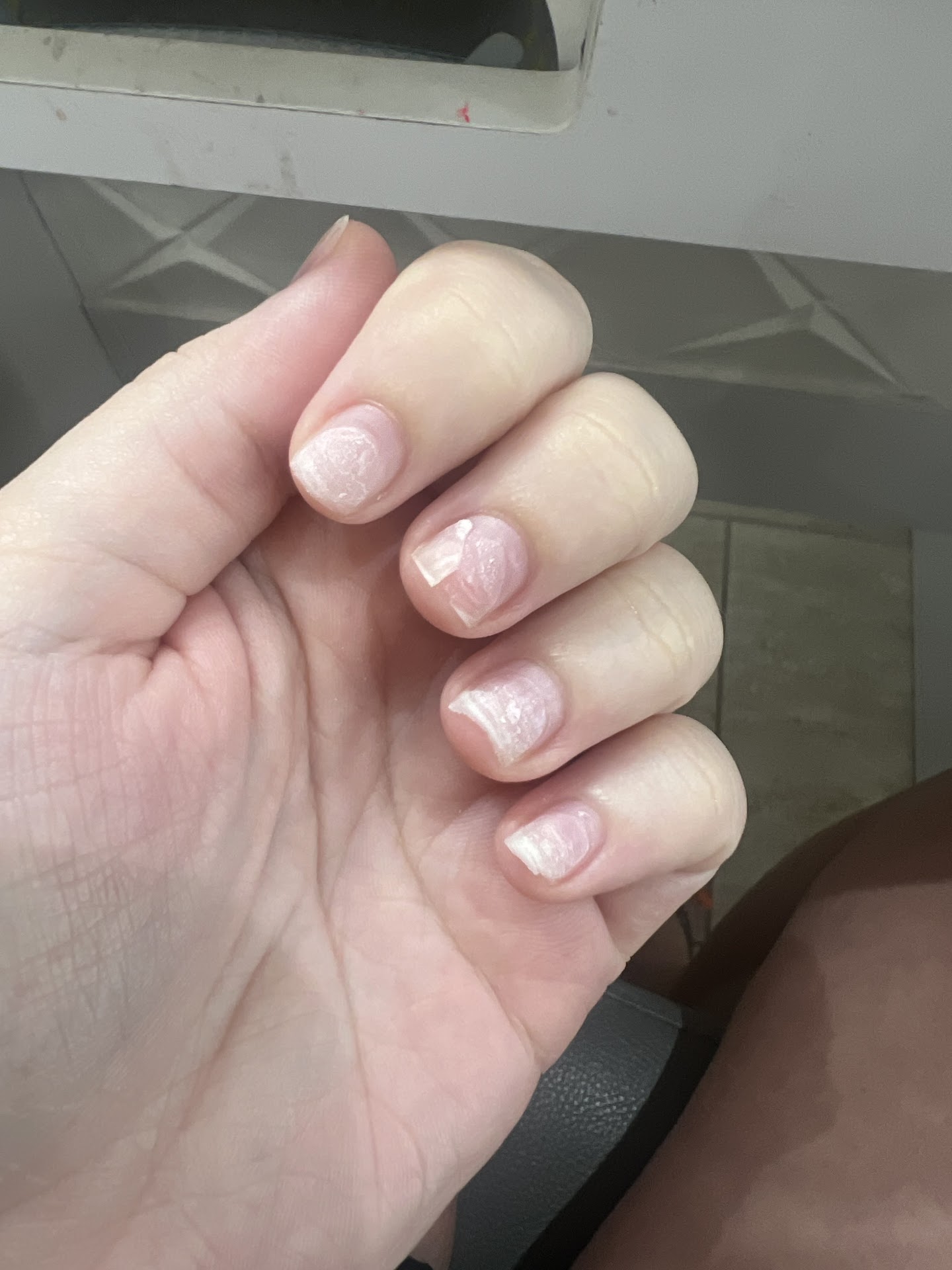 Read moreWent here for the second time and am very disappointed. 3 weeks ago I got acrylic nails done. When I came home they hurt my nails and I wasn’t happy. After 3 weeks I decided to have them removed because I didn’t like them and they still hurt/were uncomfortable. When I was there and said I wanted them removed, 2 different people questioned why I wanted them off and like me not liking them wasn’t a valid enough reason. When I went to get them removed, the employee used another nail to pull them off - he would wedge the corner under my nails to lift it and pull, there was no soaking, nothing. It absolutely destroyed my nails (see picture). After 4 nails the technician stopped this method and grinded/filed them off instead. I was asked if I got my acrylics done at this salon and the technician seemed shocked to hear that I got it done there. He even asked me who did them and when I said “the lady next to you” he shook his head. My nails were so brittle and fragile from this. I was then told not to get acrylics again because I didn’t have the right type of nails for it. I showed him my inspo pic for my nails and explained the color changes I wanted and he said he could do it. The inspo pic is provided (blue nails) and the pink is what I received. When I was finished he even said something a long the lines that he didn’t work with such short nails and I could tell he knew they looked bad. I was never asked what nail shape I wanted and some are square and some are round. By the time I got home (20 min) my nail color started turning purple (see picture of thumb). It’s been a few hours since I left and one nail already chipped. I am so disappointed. The employee was very nice I appreciated how he handled this situation - he did try his best… but honestly this is just terrible. I wasn’t going to leave a bad review because of how the employee did try to rectify the situation but… this is just too much. I feel like I can’t even take it off because my nails will just fall apart with it and be worse. On a positive note - I got a pedicure with Denise (I think that was her name) and that came out well and...