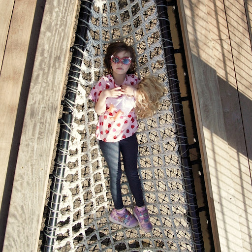 On the bridge with the binoculars is a fun net area for kids to play high above the ground. If you have a fear of heights, it may make you a little dizzy. Close by you can find a nice paved trail, which includes a library storybook walk.