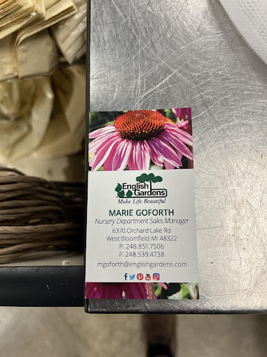 Read moreGood Morning, For the record, I consider English Garden to be a top-notch nursery. Nevertheless, it is my opinion that english gardens prices are much higher then other nursery's and stores in the West Bloomfield area. That is okay due to the quality, presentation and English Gardens return policy. However, I think with the high prices english garden should have knowledgeable employees working in their stores. On more than 10 occassions when I ask questions regarding flowers, plants etc the person had no knowledge of flowers or gardening. This morning i called and requested information regarding SunPatients, the person I talked to this morning at approx. 9:00 a.m. indicated that English Gardens does carry them. Then, when I called back to determine if English Gardens would be carrying regluar impatients this season, Scott had to refer to Jodi for answers. Unfortunately, Jodi said that they would not be carrying Sunpatients only New Guinea Impatients. Initially, Scott did not want to reveal Jodi's name when asked and when he finally did and I ask to speak to her, I was told she was in a meeting. Jodi, is a wonderful manager she is always helpful and...