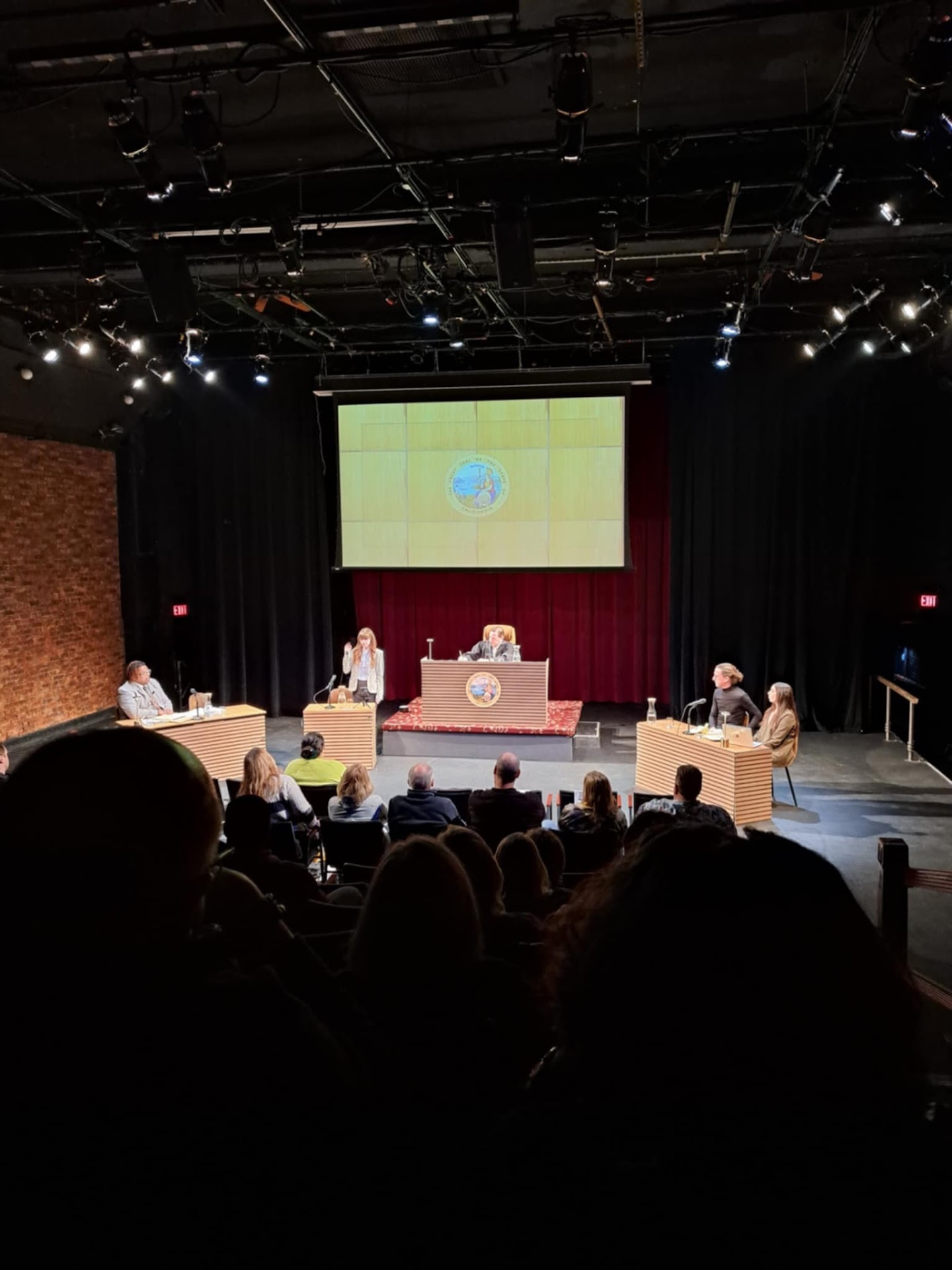 After making our way to the lower level to select seats, pushing our way through the plastic tacked from the ceilings , we entered into the mind of a killer. Dimly lit. Shredded tarps and countless business cards. The stage in runway fashion, we were fortunate enough to get the side seats closet to the soundboard. It was delicious perfection.