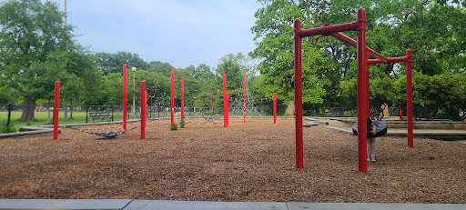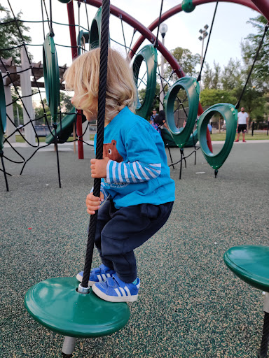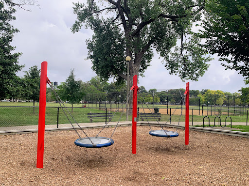 This playground - one of 5 in Humboldt Park - is located in the northeast corner of the park just north of the Humboldt Park lagoon. This playground is also somewhat not traditional - there aren't standard toddler or belt seat swings or even a slide in the entire sprawling playground! Instead, there are a few non-traditional swings (one tire swing and a few saucer swings), a rope net climbing structure, a collection of rope net traverse elements, and an area with spinning elements. The centerpiece of this playground is a large water spray feature.