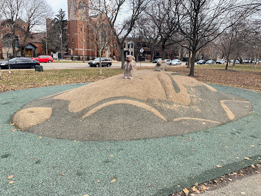 Read morePalmer Square Park is amazing and there is a small play area in the middle of the park that is part playground and part art installation. The playground is designed for younger children (under 5 years old) and is based on the book "The Velveteen Rabbit." The play area is somewhat linear and consists of four area connected by a walking path as well as a stepping stone path. One area is a raised stage with an audience of carved animals, the next is a little area with sculptural benches that look like tree stumps, the next is a flat area with a few pieces of equipment including a slide set into a small hill, and finally there is a small mound with two rabbit sculptures on top.